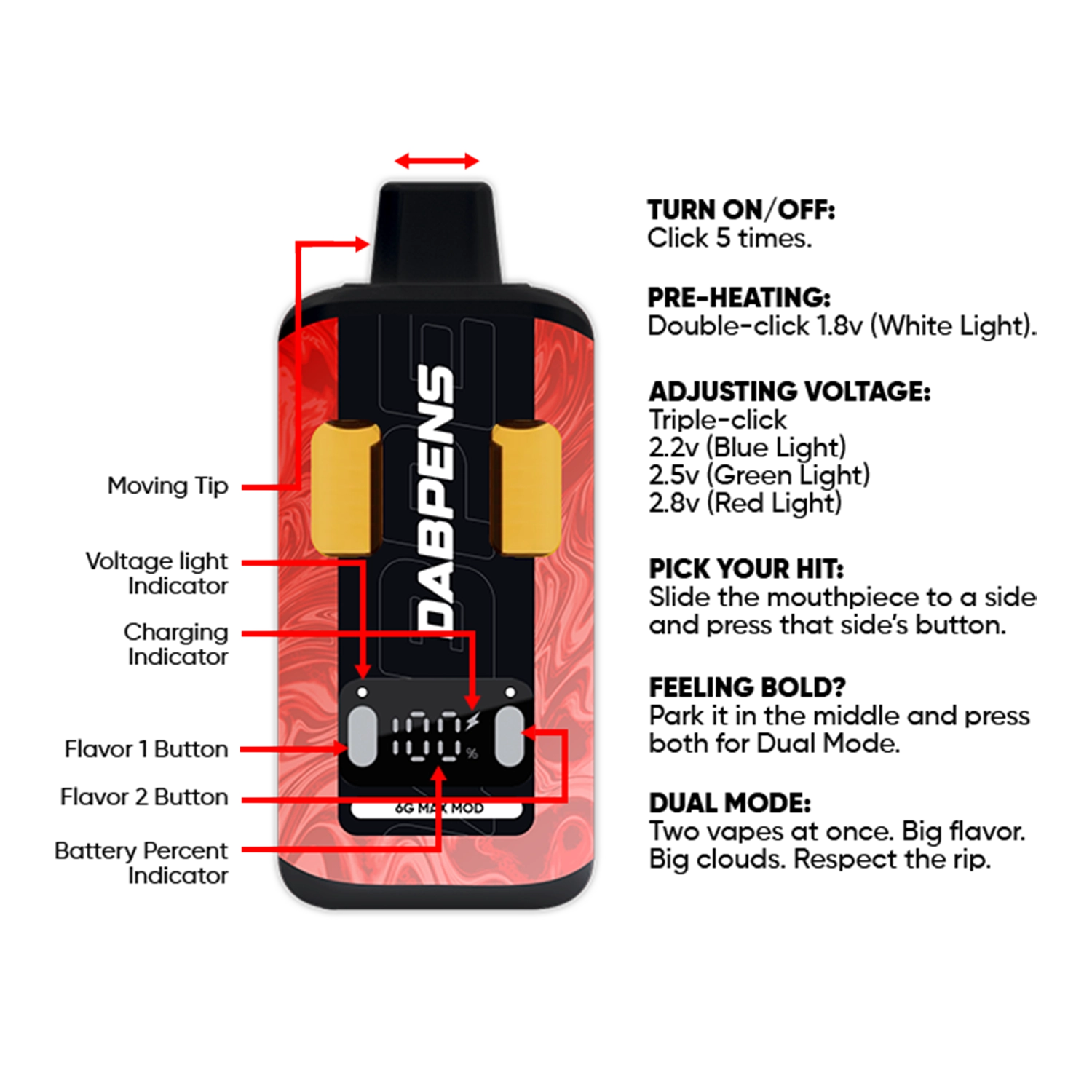 This rechargeable distillate vape includes adjustable voltage and dual-flavor modes, allowing for customized vapor output. Built for reliability and flavor consistency, it maintains performance across the entire 6g capacity.